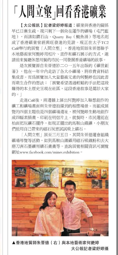 人間立壑 Mines TC2 Cafe 16th Jan – 31st Mar , 2017 TaKungPao Media Coverage Opening Reception 16th Jan, 2017 Share this: Share on X (Opens in new window) X Share on Facebook (Opens in new window) Facebook Like Loading...